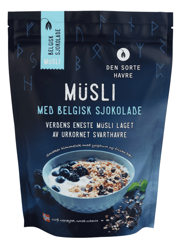 Musli med belgisk sjokolade fra Den Sorte Havre er ren. usprøytet norsk svarthavre fra Østfold blandet med en fjerdedel belgisk sjokolade av den høyeste kvalitet.Dette smaker utrolig godt og inneholder bare 9% mer kalorier enn rent havregryn. Spises gjerne med litt bringebærbiola eller melk rett fra posen. Metter lenge. med masse fiber og lav gluckemisk indeks.