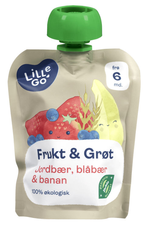 LilleGo' frukt og grøt med jordbær, blåbær og banan. Produktet er laget av økologiske råvarer og passer for barn over seks måneder.
