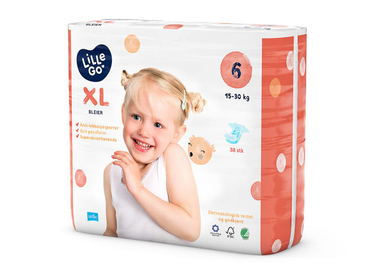 LilleGo' XL-bleier. Dermatologisk testet og godkjent. Størrelse 6, 15-30 kg.