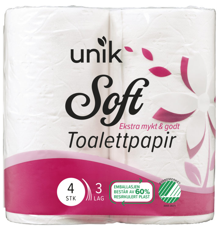3-lags toalettpapir fremstilt av 100% nyfiber. Tre lag gjør papiret sterkt og den unike pregningen gjør det mykt.